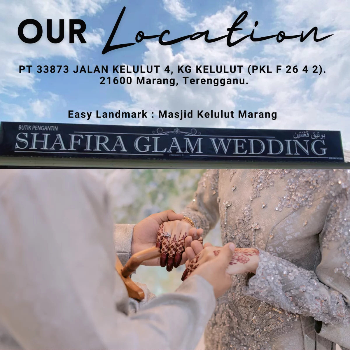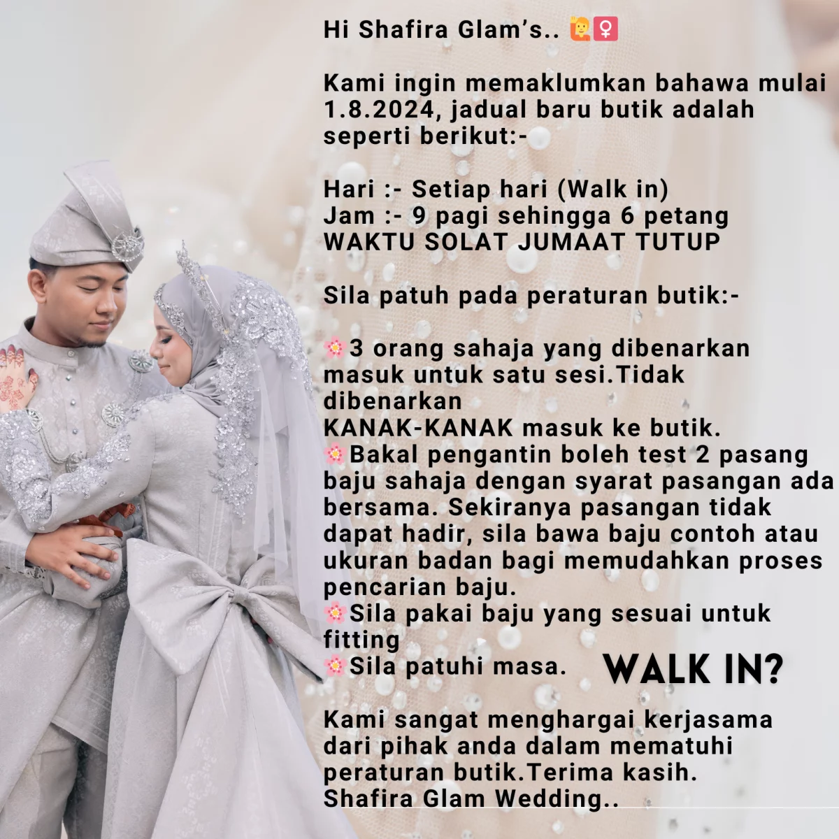 Dan, kami buka setiap hari. Kami sangat memahami jadual kerja dan kekangan masa bakal pengantin. Jadi, dengan jadual yang konsisten setiap hari akan memudahkan perancangan bakal pengantin untuk walk in ke butik..